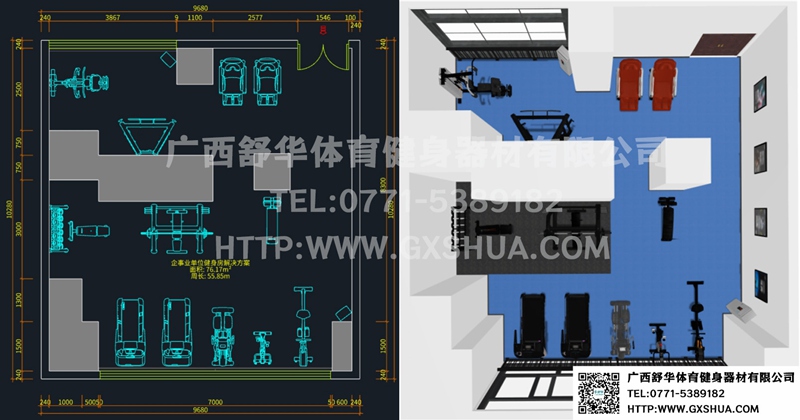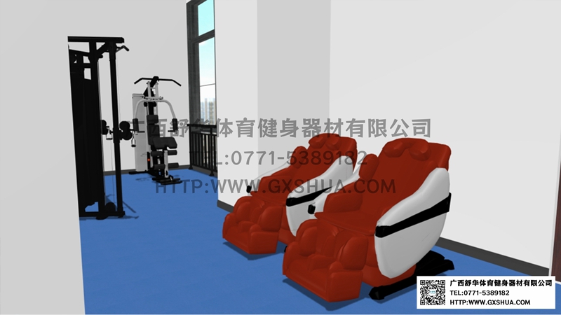 由于企业单位健身房的不规则性,根据场地、职工需求、整体预算,有氧器材区域配置星空xk跑步机2台,椭圆机、动感单车、划船器各1台,满足职工的日常有氧训练需求,有效地提升心肺功能;力量器械配置单人站综合训练器、小飞鸟,满足使用者全身锻炼的需求;自由力量区域配置史密斯机、哑铃套组、腹肌板满足多样化训练需求,促使健身训练更丰富,休闲区配置按摩椅,可以促进血液循环,让员工使用按摩椅放松身心,可以能够有效缓解工作压力。