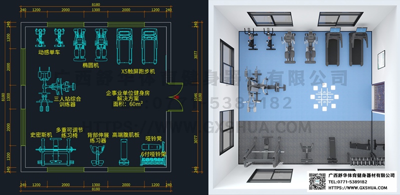 在现代办公场景中,健康管理已成为企业竞争力的重要组成部分。当有限空间遇上多元化健身需求,60㎡的企事业单位健身房如何突破物理限制,实现空间价值最大化?本文以 "功能集成化、空间集约化、使用人性化" 为设计原点,结合人体工程学原理与智能科技元素,为中小型办公空间打造兼具实用性与专业性的运动解决方案。通过科学动线规划与模块化器材配置,让方寸之地既能满足日常健身需求,又可成为企业文化传播的活力窗口。