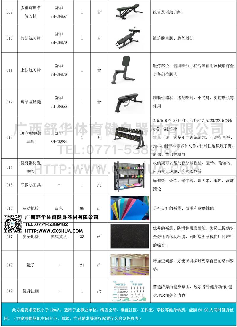 此方案要求面积小于120m²,适用于企事业单位、酒店会所、楼盘社区、工作室、学校等健身场所,能满20-25人同时健身使用。(方案根据场地空间大小、预算、产品需求等进行配置仅为启发性参考)