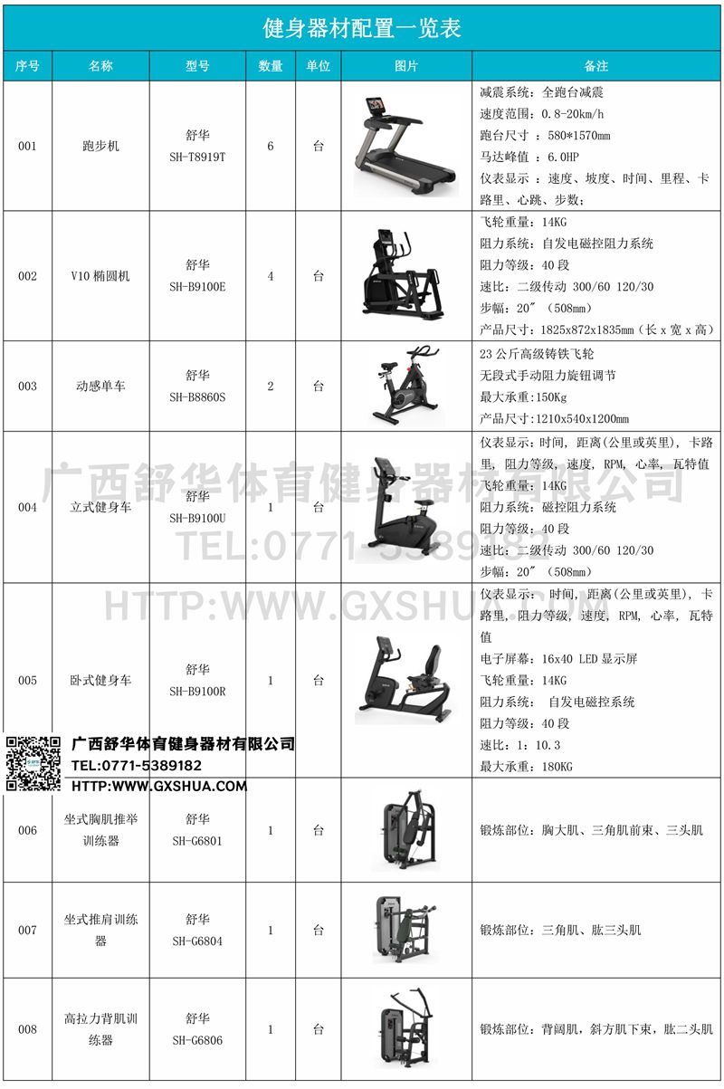 1.星空xkV9跑步机SH-T8919T*6台-V9+采用全跑台减震设计,为跑者提供舒适的落脚地感和稳定的跑步支撑,良好的缓冲防护,降低膝关节受伤风险。商用大跑台,为跑者提供从容奔跑空间,180kg承载力,580*1570纯跑台面积,满足专业健身需求。V9+采用F级商用马达,6HP峰值马力,20km/h最高速度,提供源源不断的动力。V9+内置健身直播软件,每周提供直播课程,内含大量专业线上健身点播课程,可为健身房不同人群提供多样化健身课程服务。